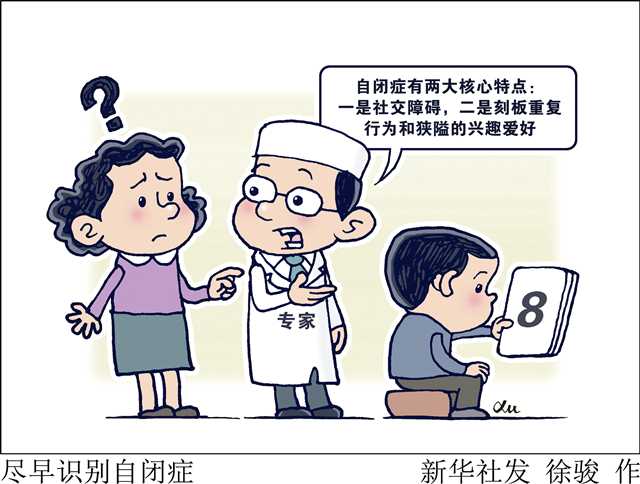 嬰幼兒期自閉癥可能出現的癥狀:6月齡后,沒有社交性微笑或高興的情緒表達、缺乏眼神接觸;9月齡后,不能通過發聲、微笑或其它非語言交流來分享;12月齡后,沒有咿呀學語、不能通過姿勢動作進行交流(指向、拿、揮手等);16月齡后,沒有語言;24月齡后,發出無意義的2字詞語。