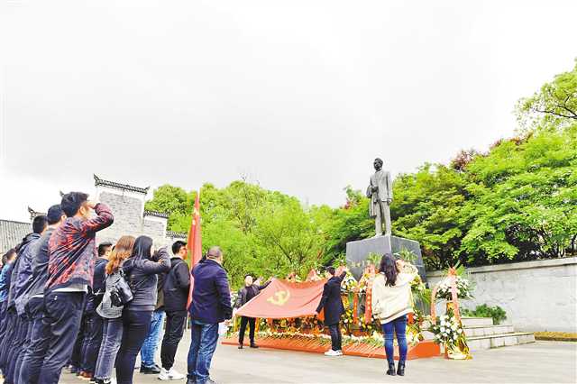 4月2日,酉陽土家族苗族自治縣桃花源旅游投資集團公司黨員在趙世炎烈士故居重溫入黨誓詞,緬懷革命先烈,開展黨史學習教育。通訊員 邱洪斌 攝/視覺重慶