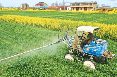 隨著天氣轉暖,江蘇省海安市隆政街道聯合村俞萬家庭農場的小麥長勢良好,進入拔節抽穗的關鍵時期。當地村民搶抓農時,利用植保機對小麥進行防病害作業,為夏糧增產增收打下基礎。圖為聯合村村民對小麥進行防病害作業。