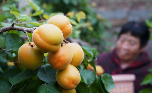 4月6日,順平縣蒲上鎮伍郎村育順農業基地的工人在大棚內采摘甜杏。