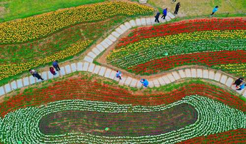 4月7日,游人在陜西省咸陽市咸陽湖景區賞花(無人機照片)。隨著氣溫升高,各地鮮花盛開,人們紛紛來到戶外感受春光。新華社發(李軍朝 攝)