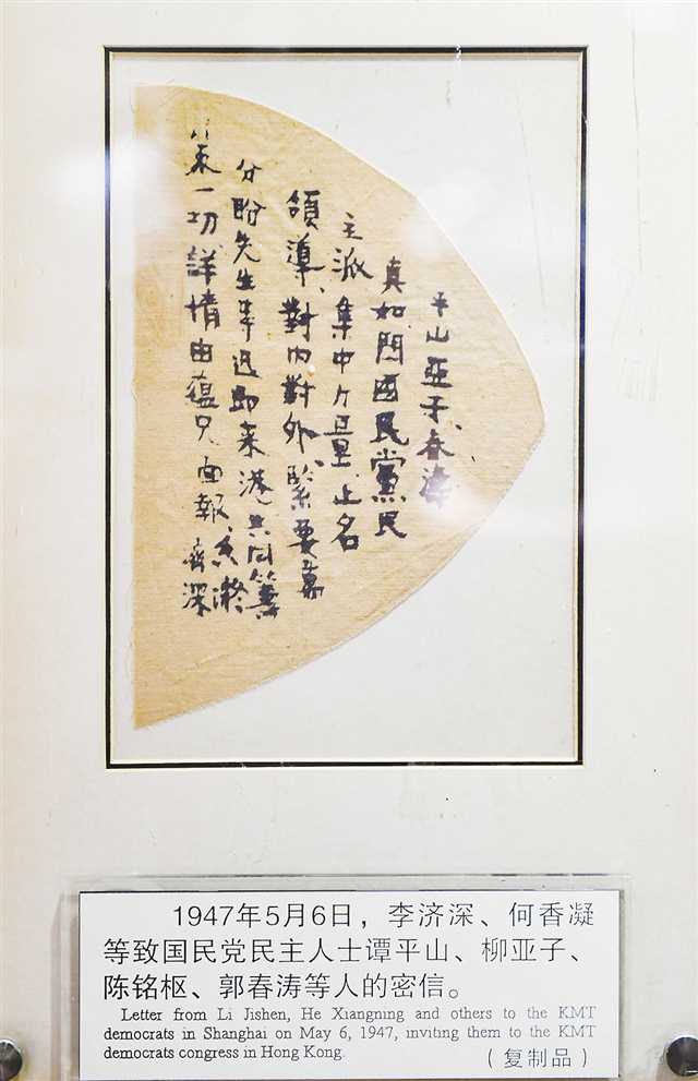 為了聯系到民聯的同志“迅即來港,共同籌策一切”,李濟深、何香凝聯名寫了這封特殊的信。為躲避國民黨軍警的嚴密檢查,大家仔細斟酌每一個字詞,由李濟深在這塊白綢巾上寫了簡明扼要、含義深刻的56個字,將它縫在衣服里面,由朱蘊山帶到上海,信尾上就有“詳情由蘊兄面報”這句話。