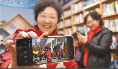 江蘇省揚州市邗江區新盛社區圖書館內,一位大媽展示自己的視頻作品。