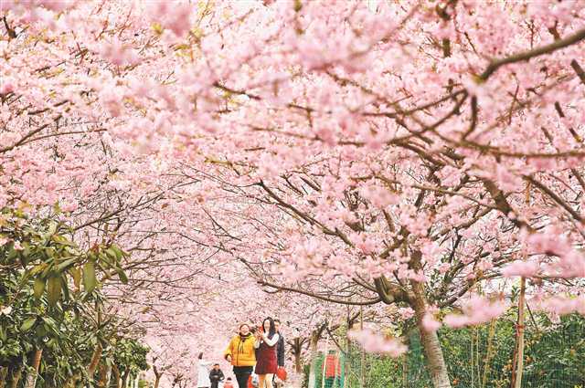 2019年2月16日,北碚區澄江鎮五一村“櫻花橘香”農業公園,市民欣賞盛開的櫻花。特約攝影 秦廷富/視覺重慶