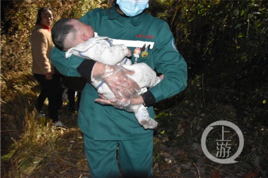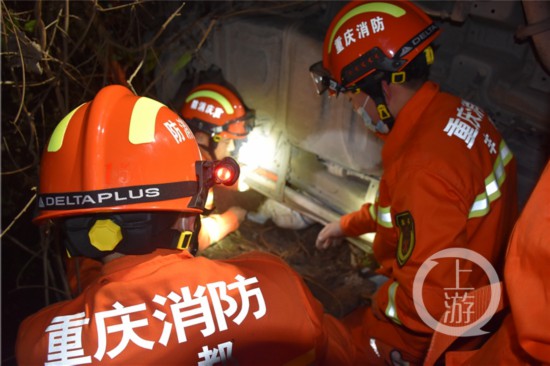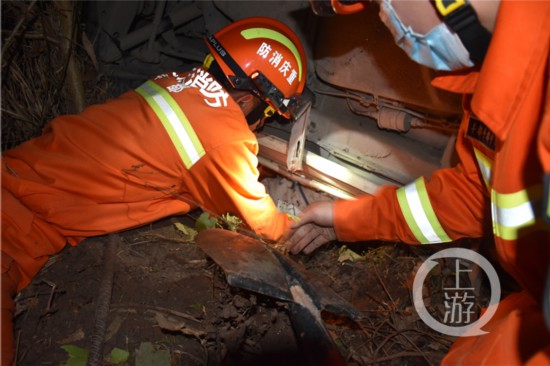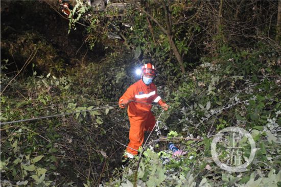 為盡快抵達事故車輛旁,消防救援人員立即兵分兩路,一路通過架設繩索直接穿過荊棘叢下滑到事故車輛旁偵查情況。另一路則攜帶救援器材,與村民一起尋找可以抵達事故位置的小路。兩分鐘后,第一組指戰員利用繩索來到越野車旁。此時救援人員了解到,村民已經對車輛附近進行了搜尋,排除了嬰兒摔落在車輛附近的可能,村民還告訴救援人員,此前若隱若現的啼哭聲也可以判斷,嬰兒應該就在側翻車輛的下方。