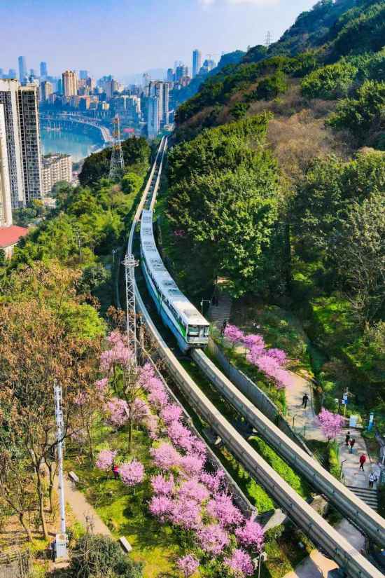 開往春天的列車!重慶軌道交通2號線佛圖關段,大面積的美人梅花盛開,單軌列車穿行在花海中,如開往春天的列車,成為一道城市亮麗的風景線。鄒樂 攝