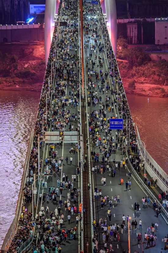 警方對千廝門大橋雙向交通采取臨時封閉,大橋儼然變成了一條“步行街”,游客們可以在橋面上隨意行走觀看,在“最佳拍照點”攝影、拍照留念。圖片來源:平安重慶