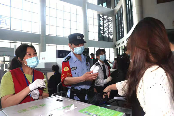 民警在重慶北站南廣場進站口對旅客攜帶物品進行安全檢查 重慶鐵路公安處供圖。
