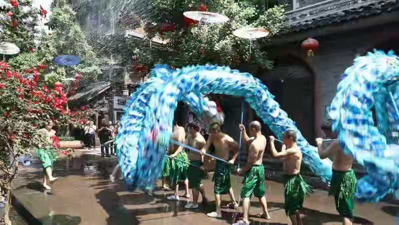 在銅梁安居古城西街,一條藍色16米長的藍色“水云龍”,從迎龍門呼嘯而出,在赤膊的漢子舞動下,時緩時急上下飛舞。所到之處,游客們爭相用水盆向龍身潑水,參與當地獨特的民俗文化,感受漫天水花和激烈龍舞,帶來的視覺盛宴。