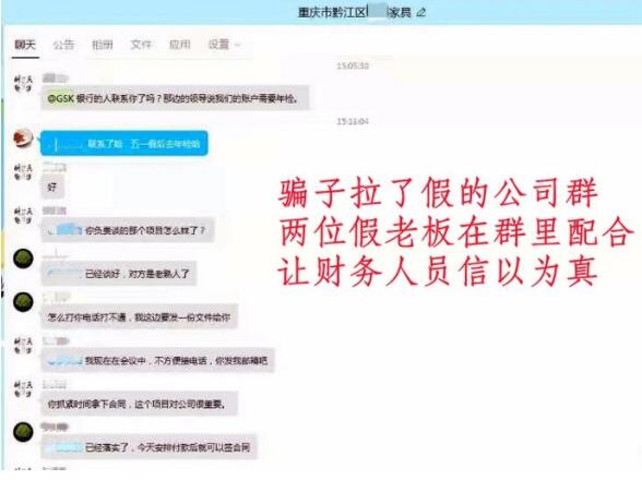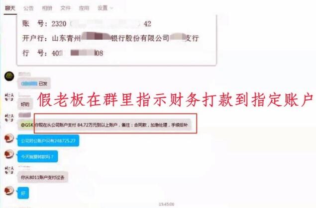 事發那天下午,“張先生”在群里對小蒙說“開會不方便接聽電話”,并在群里發了付款信息,讓其加急處理,還交代說“手續后補”。同時,兩人還在群里對話,“已經談好,對方是老熟人了”“你抓緊時間拿下合同,這個項目對公司很重要”……這讓小蒙也信以為真了。