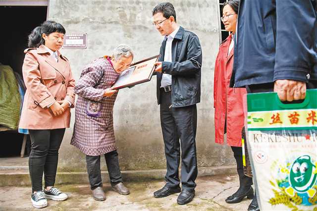 五月七日,永川區勝利路街道豐田村,區退役軍人事務局工作人員將烈士賴云清墓碑的照片送到陳學明老人(左二)手中。記者 崔力 攝\視覺重慶