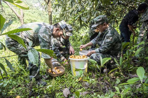 民兵幫助農戶采摘枇杷。洛磧鎮人民武裝部供圖
