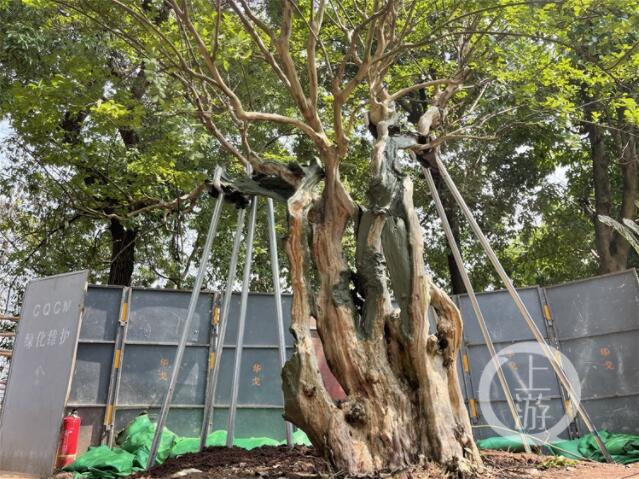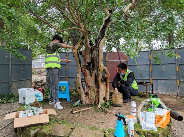 今年4月初,江北區園林綠化管理所與市園林綠化中心一起對這株紫薇進行了一次全面“體檢”。