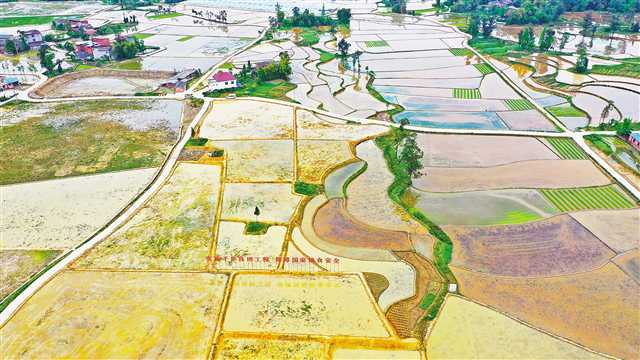 5月7日,梁平區星橋鎮兩路村,高標準農田阡陌有序、整齊成片。農田之上,村民們卷起褲腿,帶上斗笠,忙著填溝蓄水,為下一步插秧做好準備。