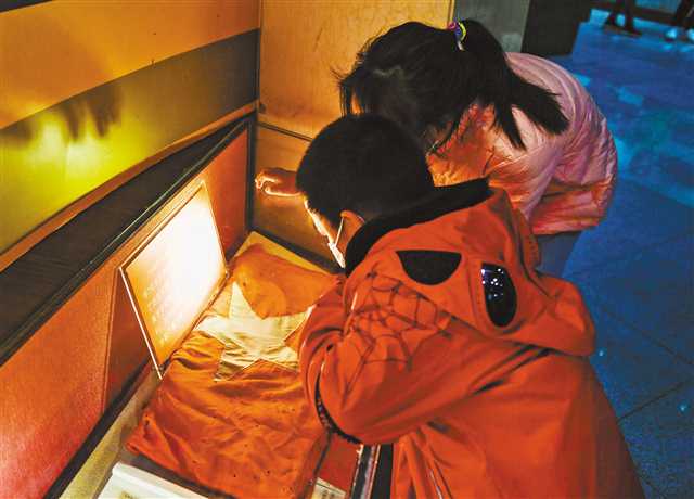 “這就是重慶升起的第一面五星紅旗,它用紅綢被面和黃紙制成!痹谥v解員高潔的指引下,重慶日報記者看到一面紅旗疊放整齊,靜靜地躺在玻璃展柜中,已有些褪色,針腳也略顯粗糙。
