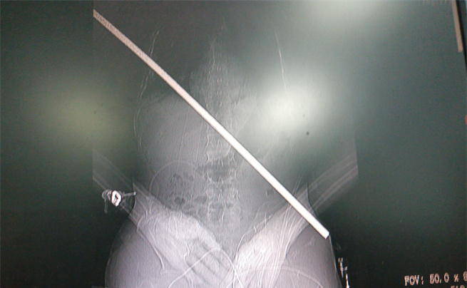 術中,打開胸腔和腹腔,發現傷者右肺臟已被鋼筋穿透,鋼筋緊貼脊柱,隔肌、橫結腸及小腸系膜等被貫通,幸運地是鋼筋避開了心臟,從下腔靜脈后方、腹主動脈前方穿過。術中還由消化內科文良志副教授行胃鏡檢查排除了食管損傷。放射影像科曹瑞、王承諾技師利用先進的移動CT在手術室行頭顱CT檢查進一步排除了嚴重的顱腦損傷。