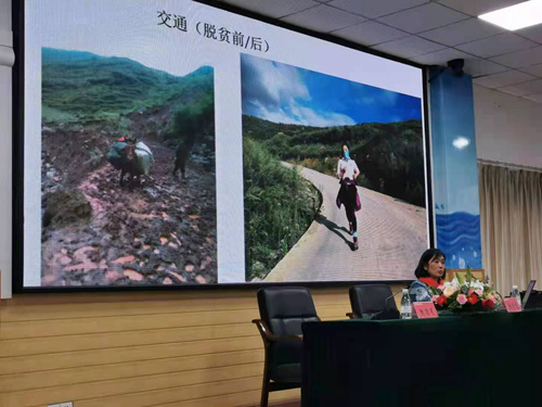 “這是涼山人脫貧前和脫貧后的房屋對比圖。脫貧前,房屋內十分昏暗,拍照時大家臉上都沒什么笑容。脫貧后,大家搬進敞亮的兩層小樓,還有了獨衛和太陽能熱水器,他們興奮地拉著我進屋合影留念!眻蟾鏁F場,謝彬蓉眼含淚光,用一張張照片、一個個來源于生活的生動例子向在場師生們講述大涼山近年來的脫貧故事。接地氣的語言、樸實的案例、謝彬蓉的奉獻精神讓師生們頗受感動,大家聽得津津有味,頻頻自發鼓掌。