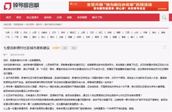 人民網重慶5月20日電 (陳琦)“幼時在新德村成長,彼時喧囂熱鬧,承載著老重慶的美好記憶……”近日,有熱心網友通過人民網《領導留言板》留言,對重慶正在積極推進的城市更新行動——老舊小區改造,提出建議,希望自己曾經居住的七星崗新德村老社區煥新蝶變。