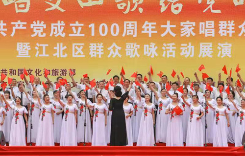 人民網重慶5月20日電 5月20日,“唱支山歌給黨聽”——重慶市慶祝中國共產黨成立100周年大家唱群眾歌詠活動啟動儀式暨江北區群眾歌詠活動展演,在觀音橋步行街舉行。