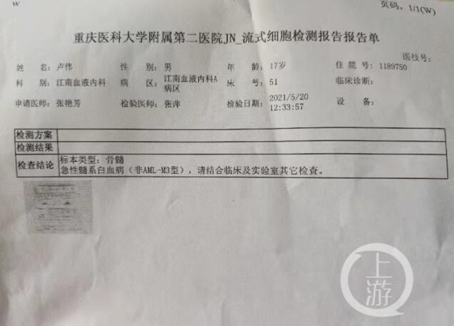 5月18日,他住進了重慶醫科大學附屬第二醫院江南血液內科51床。一番檢查后,5月20日,原本是一個充滿愛的日子,他卻得到了一個讓自己崩潰的消息——急性髓系白血病。