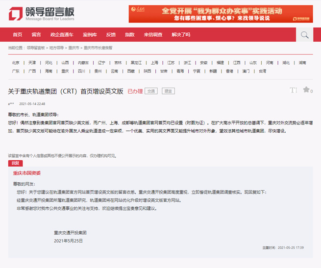 網友建議重慶軌道集團官網增設英文版