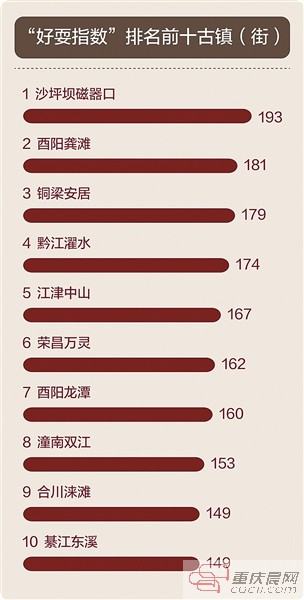根據這一好耍指數,在納入評價的30個古鎮(街)中,磁器口、龔灘、安居、濯水、中山5個古鎮脫穎而出,成為五星級“最好!惫沛;萬靈、龍潭、雙江、淶灘、東溪、松溉、西沱、豐盛、木洞、塘河被評為四星級“好耍古鎮”;白沙、洪安、偏巖、龍興、走馬、吳灘、三倒拐、大昌、寧廠、石蟆、安富、溫泉、羅田、銅罐驛、青羊被評三星級“好耍古鎮”。