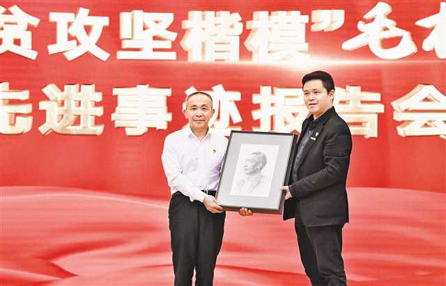 五月二十六日,四川美術學院院長龐茂琨向毛相林贈送自己創作的毛相林肖像畫。記者 齊嵐森 攝\視覺重慶