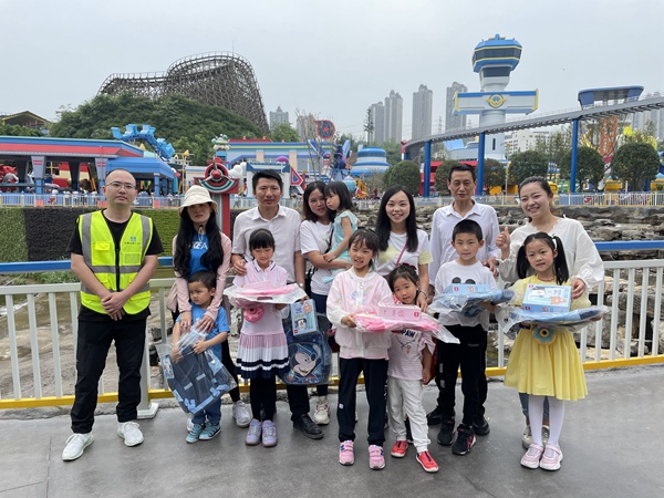 重慶歡樂谷的參建工人和他們的孩子們來到歡樂谷二期超級飛俠主題區游玩。中建五局三公司供圖