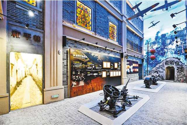 順著展廳往前,一個由頂部延伸至墻面的LED巨幕影片給人以巨大的視覺沖擊。LED巨幕上,多架轟炸機從頭頂飛過,將地面的建筑物炸得粉碎,而前方一個被炸毀的洞口上“愈炸愈強”四個字格外醒目。短片真實地還原了“從持續不斷地被轟炸,到愈炸愈強的山城人民在廢墟上站立起來場景”,將重慶人民頑強抗戰、不屈不撓的精神展現得淋漓盡致。