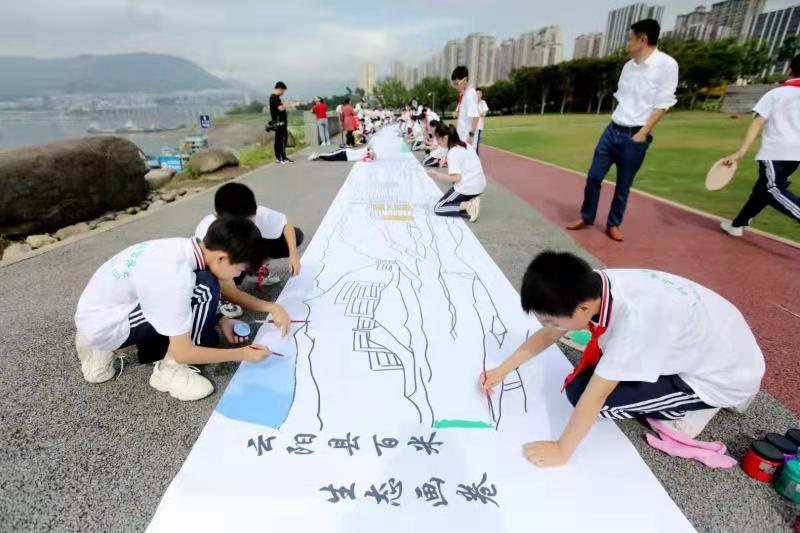 早上8點,來自云陽縣實驗小學六年級的百余名學生在老師的帶領下早早來到了活動現場!胺浅<,老師說我們今天要來一起完成一幅長卷!绷昙2班李妍錫同學激動不已。
