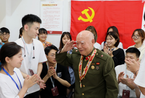 91歲的倪濟人,有著65年黨齡,雖然年事已高,但他依然精神矍鑠,身上那套綠色軍裝和胸前的軍功章讓同學們充滿敬佩之情。他結合自身經歷,深情講述了參軍入伍、保家衛國的革命故事,以及在教育崗位上兢兢業業、無私奉獻的拼搏歷程,深深感動了在場的每一位黨員師生。