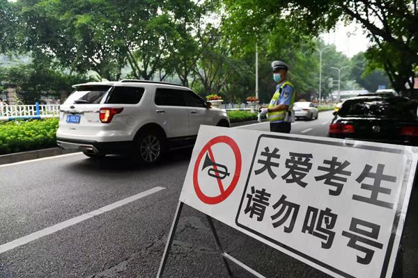 重慶一中高考考點外,交巡警設置“請勿鳴笛”提示牌,為考生營造安靜的環境。鄒樂攝