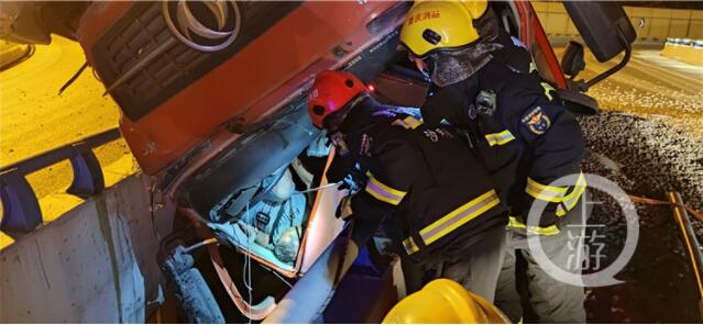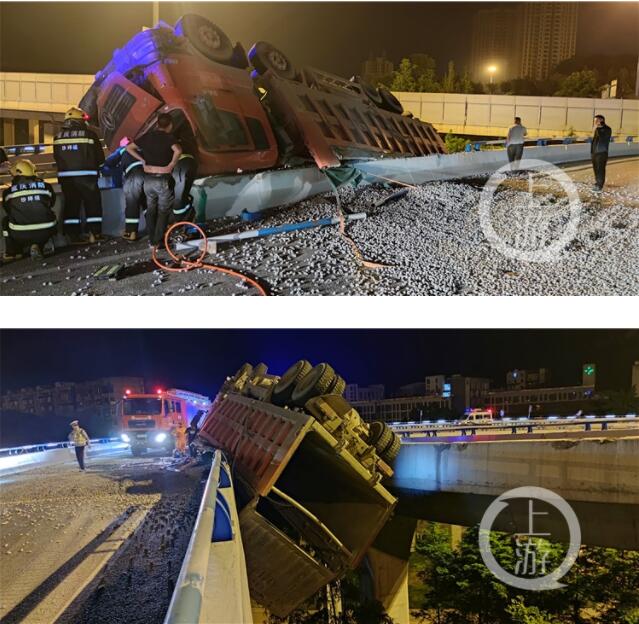 6月6日凌晨3時許,沙坪壩區雙碑隧道出道口往雙碑方向的高架橋上發生一起驚險車禍。一大貨車滿載石子在高架橋上沖出護欄,沙坪壩消防救援支隊井口消防救援站接警后前往救援。