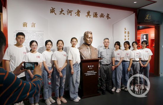 圖為觀展的師生代表與范長江銅像合影。
