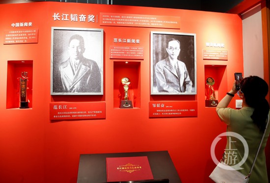 “范長江與重慶”展覽館的展陳面積為540平方米左右。陳設一共分為五個部分,包括范長江大事記和報紙墻、范長江簡介、范長江與重慶、范長江對新聞事業的貢獻、長江韜奮獎。展陳文字1萬余字,圖片87幅、影印件3件,范長江著作原件10部,其他圖書24本,其它實物25件,銅像一座,浮雕一座,制作紀錄片1部。史料豐富,不少都是第一次與觀眾見面,比如說現場陳列的書籍是重慶市圖書館館藏的民國時期的作品,還有范長江結婚留言簿、范長江與毛主席在一起的彩色照片在全國也是唯一展出。