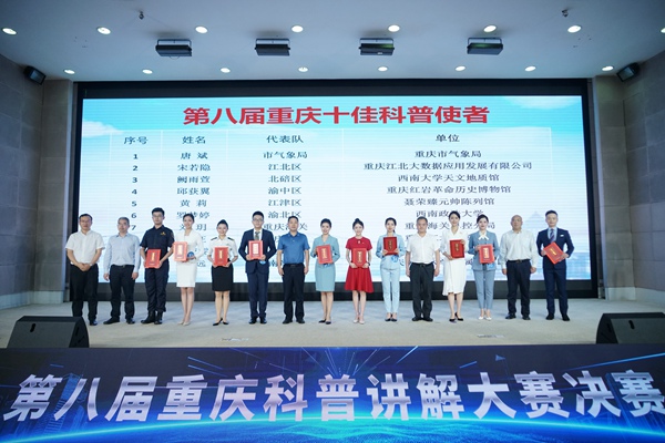 經過激烈的角逐,決賽共評選出一等獎3名,二等獎7名,三等獎10名,此外,還頒發了優秀組織獎、最佳人氣獎、最佳形象獎、最佳口才獎,以及“第八屆重慶十佳科普使者”。