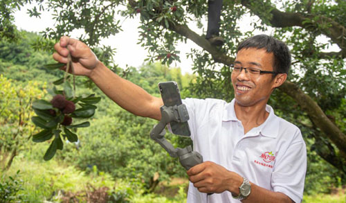 6月10日,慈溪市橫河鎮農民謝文科使用手機直播向網友展示剛采摘的楊梅。