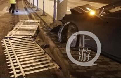 在現場,一輛黑色轎車撞倒道路中央的一片隔離護欄,車頭、護欄嚴重受損,駕駛員頭部受輕微傷。民警對駕駛員進行檢測,排除了他酒駕、毒駕嫌疑。