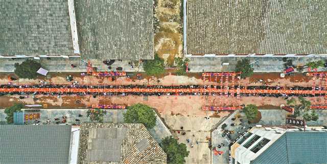 2020年9月20日,黔江區濯水古鎮,游客在美食城長桌宴上品嘗市級非遺美食黔江雞雜。特約攝影 楊敏/視覺重慶