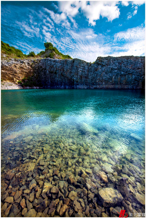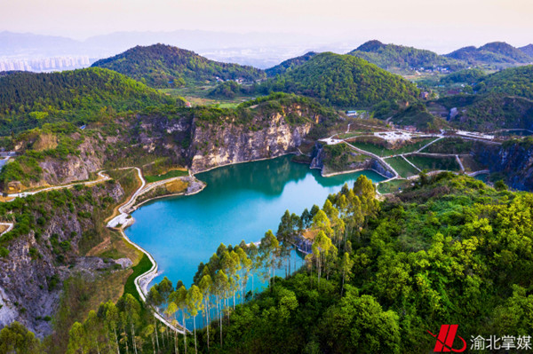 這里,曾是渝北最大的石灰巖礦區,歷經數年的開采,留下41個大大小小的露天礦坑。其中,有10余個礦坑因雨水匯集形成了坑塘湖,日積月累的湖水,在礦物質的作用下漸漸變色,宛如一串晶瑩剔透的翡翠玉石鑲嵌在斷崖峭壁之中。一個個礦坑形成了一個個深邃而斑斕的“湖泊”,絕壁環繞、碧水幽深,景致十分迷人。
