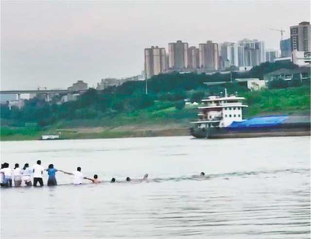 六月一日傍晚,大渡口區萬發碼頭,湍急的江面上,十幾位市民手挽著手組成一道“人鏈”,從王紅旭手中接過溺水的孩子,傳遞至岸邊。(視頻截圖)