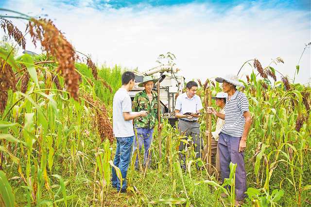 永川區紀委監委民生監督室和勝利路街道紀工委工作人員來到高粱機收現場,對楊廣橋村78戶貧困戶幫扶資金入股的千畝高粱基地項目中的涉農政策措施落實、項目資金使用管理情況進行監督檢查。(攝于2019年8月14日)記者 齊嵐森 攝