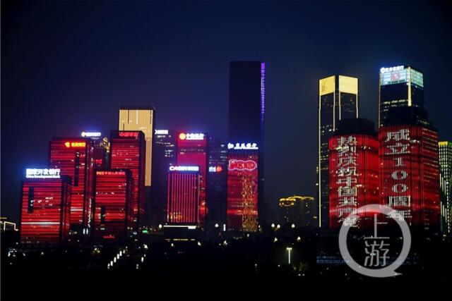 除了江北嘴十屏聯動燈幕,在觀音橋亞洲之光LED大屏、解放碑WFC等城市景觀燈飾,也呈現了“熱烈慶祝中國共產黨成立100周年”標語,以及飄揚的黨旗動態圖案。