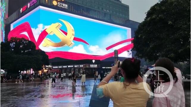 6月21日晚,重慶市慶祝建黨100周年燈光秀在解放碑商圈、觀音橋商圈等地的多塊LED屏,以及解放碑WFC、江北嘴十屏聯動燈幕上亮相,以此展示重慶城市發展變化,抒發全市人民愛黨愛國情懷。
