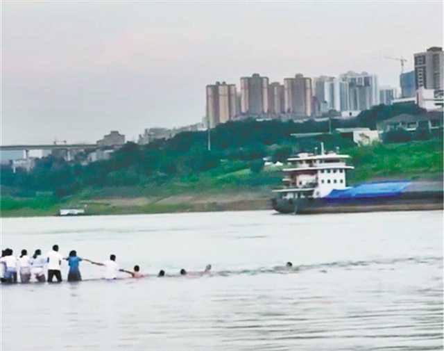 激流滾滾的長江邊,十幾名市民手拉手呼喊著,從岸邊淺灘一直向江心延伸,組成一條長達二三十米的“人鏈”。他們中,站位最淺的小腿淹沒在江水中,站位最深的僅剩一個頭露出江面。