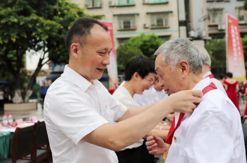人民網重慶6月24日電 6月24日,重慶市沙坪壩區土主街道舉行“奮斗百年路 啟航新征程”慶祝中國共產黨成立100周年主題活動,并為老黨員們頒發“光榮在黨50年”紀念章。
