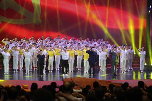 舞蹈《心中的旗幟》、群舞《春風雨露》、音樂劇《念念不忘》、獨唱《以人民為天》等節目也陸續上演。最后,文藝演出在合唱歌舞《我宣誓》中落下帷幕,舞臺上下高唱入黨誓詞,表達永遠聽黨話,永遠跟黨走的堅定信念。(劉政寧、蔣海濤)