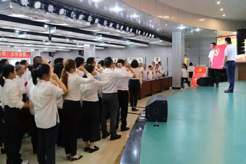 現場,工作人員為每位入黨50年的老黨員戴上大紅花,老黨員們同年輕黨員、新黨員一道齊唱國歌、重溫入黨誓詞,街道相關人員們為老黨員佩戴“光榮在黨50年”紀念章。