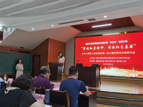 人民網重慶6月26日電 為慶祝中國共產黨成立100周年,大力推進“四史”教育融入大中小學思政課堂,積極探索大中小學思政課一體化建設的推進路徑,6月24日,由重慶財經學院馬克思主義學院組織的重慶市高校思想政治理論課“手拉手”共建行動第九組,攜手重慶清華中學、重慶理工大學,在位于巴南區的重慶清華中學共同舉辦了“學悟紅巖精神 傳承紅色基因”大中小學同上“四史”思政課一體化建設教學改革研討會。