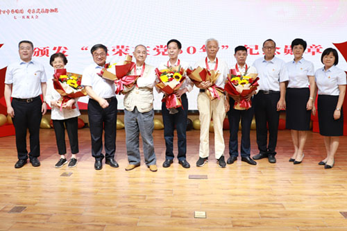 活動中,黨委領導班子成員為黨齡50年以上的黨員頒發了“光榮在黨50年”紀念勛章,并獻上鮮花。同時,對中心“兩優一先”代表、“三個一百”征集活動獲獎作品代表、演講比賽獲獎選手進行了頒獎和表彰。